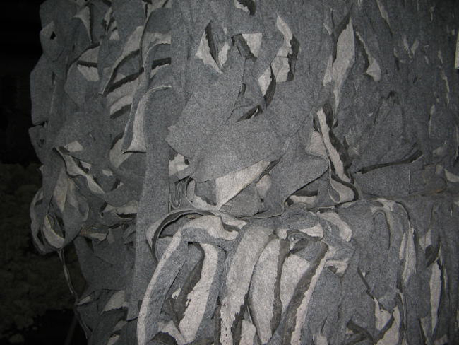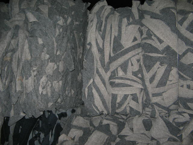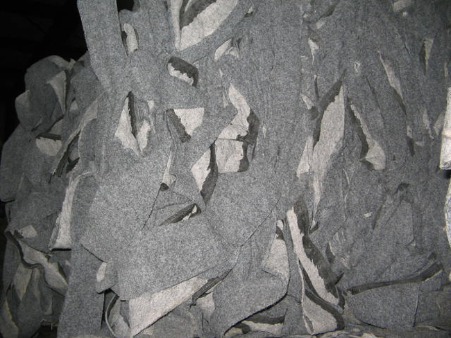 Below PP scraps stripped out pvc vinyl and foam backings, a few metal clips on pp scraps.
